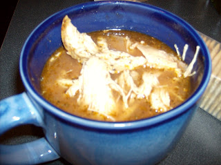 Remove chicken breasts from the crock and remove the meat from the bone. The chicken should be so tender it will shred right off the bone. If you have large pieces of chicken like we did, you may want to cut the chicken up a little to make them easier to eat with a spoon.